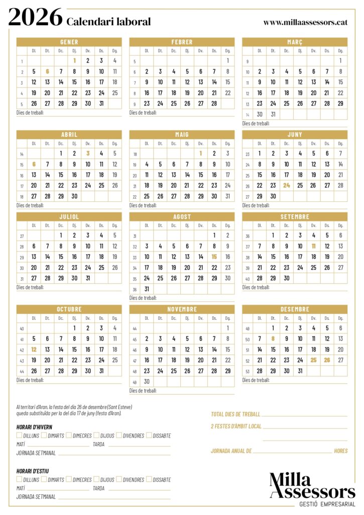 1 de gener, dijous6 de gener, dimarts3 d’abril, divendres6 d’abril, dilluns1 de maig, divendres24 de juny, dimecres15 d’agost, dissabte11 de setembre, divendres12 d’octubre, dilluns8 de desembre, dimarts25 de desembre, divendres26 de desembre, dissabte